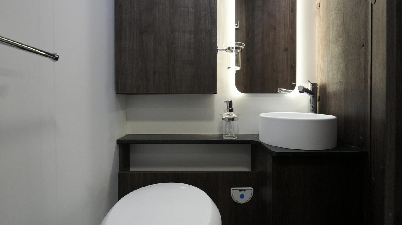 In een afzonderlijke ruimte bevindt zich het toilet en lavabo met gepersonaliseerde accessoires.